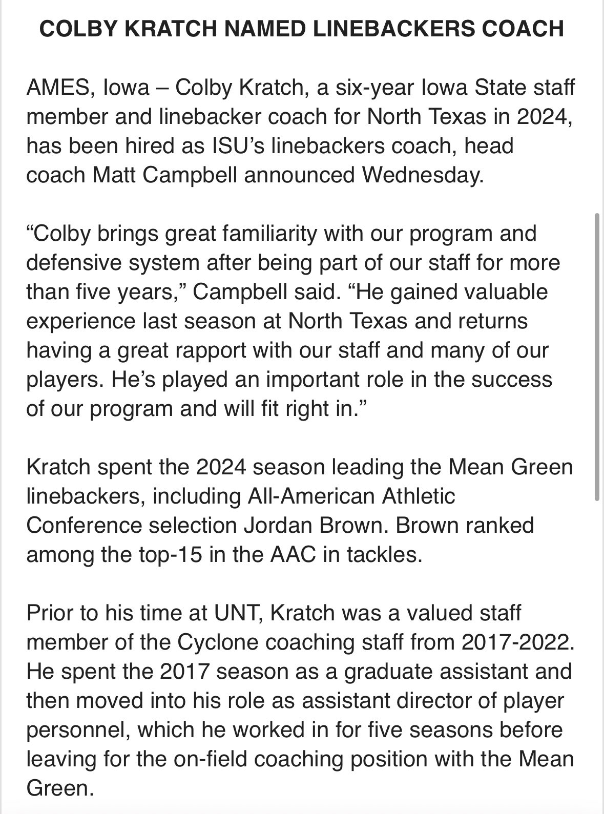 Source : www.facebook.comTravis Hines on X: “Iowa State makes Colby Kratch’s hiring at LBs